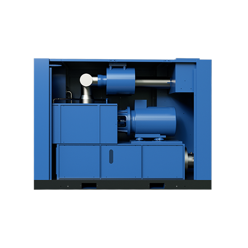 無油螺桿空壓機通過兩個螺桿轉子壓縮空氣,然后通過水氣分離器將壓縮空氣中的水分去除。同時,由于沒有噴油冷卻,通常對壓縮空氣進行冷卻,配備預冷器、中冷器、后冷器,以滿足出口溫度的要求。在轉子軸上通過高性能軸封防止?jié)櫥托孤┑綁嚎s空氣中,實現無油。